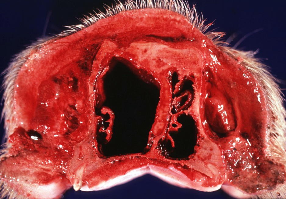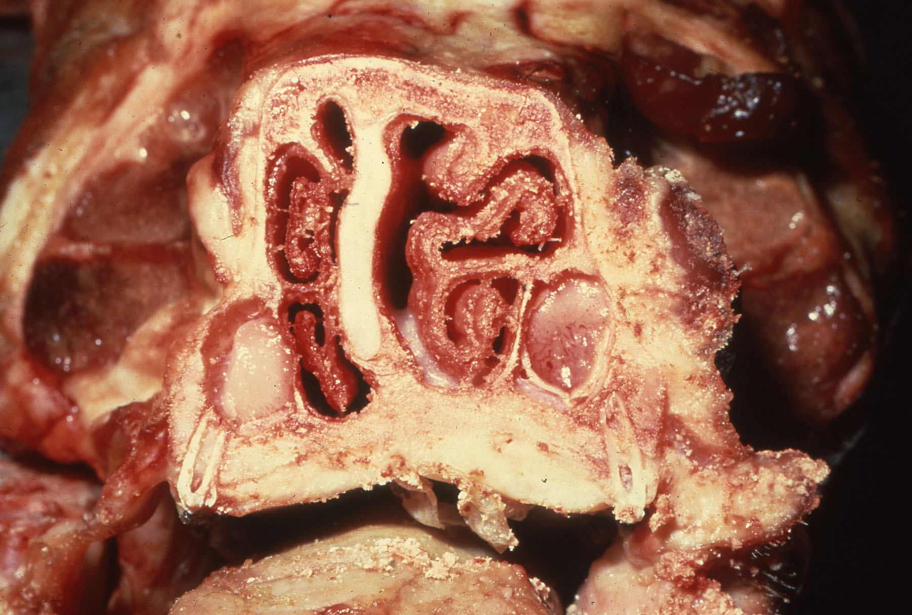 Besides the clinical signs described previously, severely affected pigs often have a distorted snout, where the nose points towards the more severely affected side. So if a veterinarian comes into a barn of pigs with twisty noses, they already have a pretty good idea of whatโs going on! At necropsy, one of the easiest methods for diagnosis is sectioning the nose so you can compare the two nasal turbinates. On these sections, the normally scroll-shaped turbinates will be distorted or even missing!
