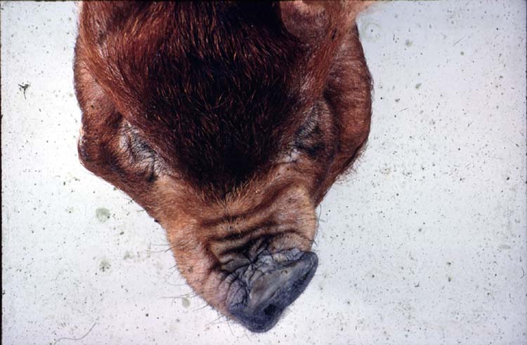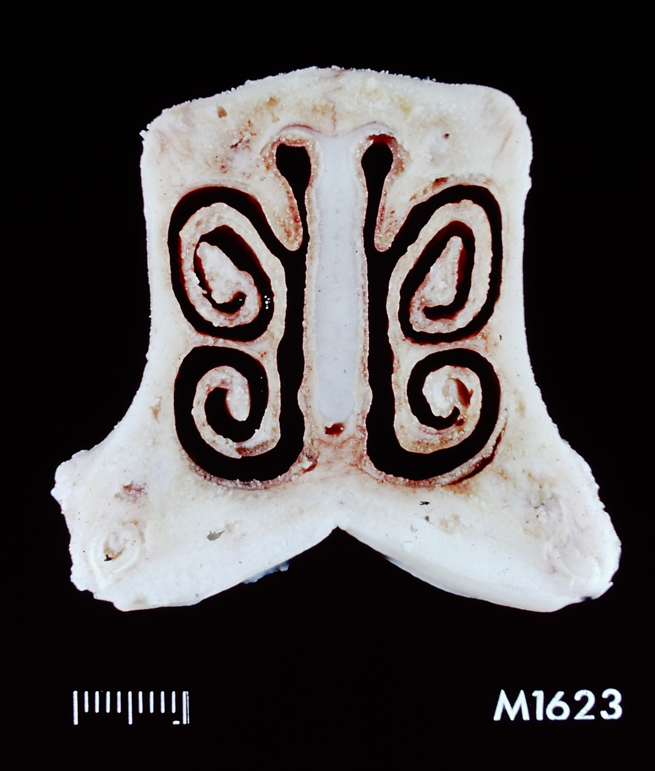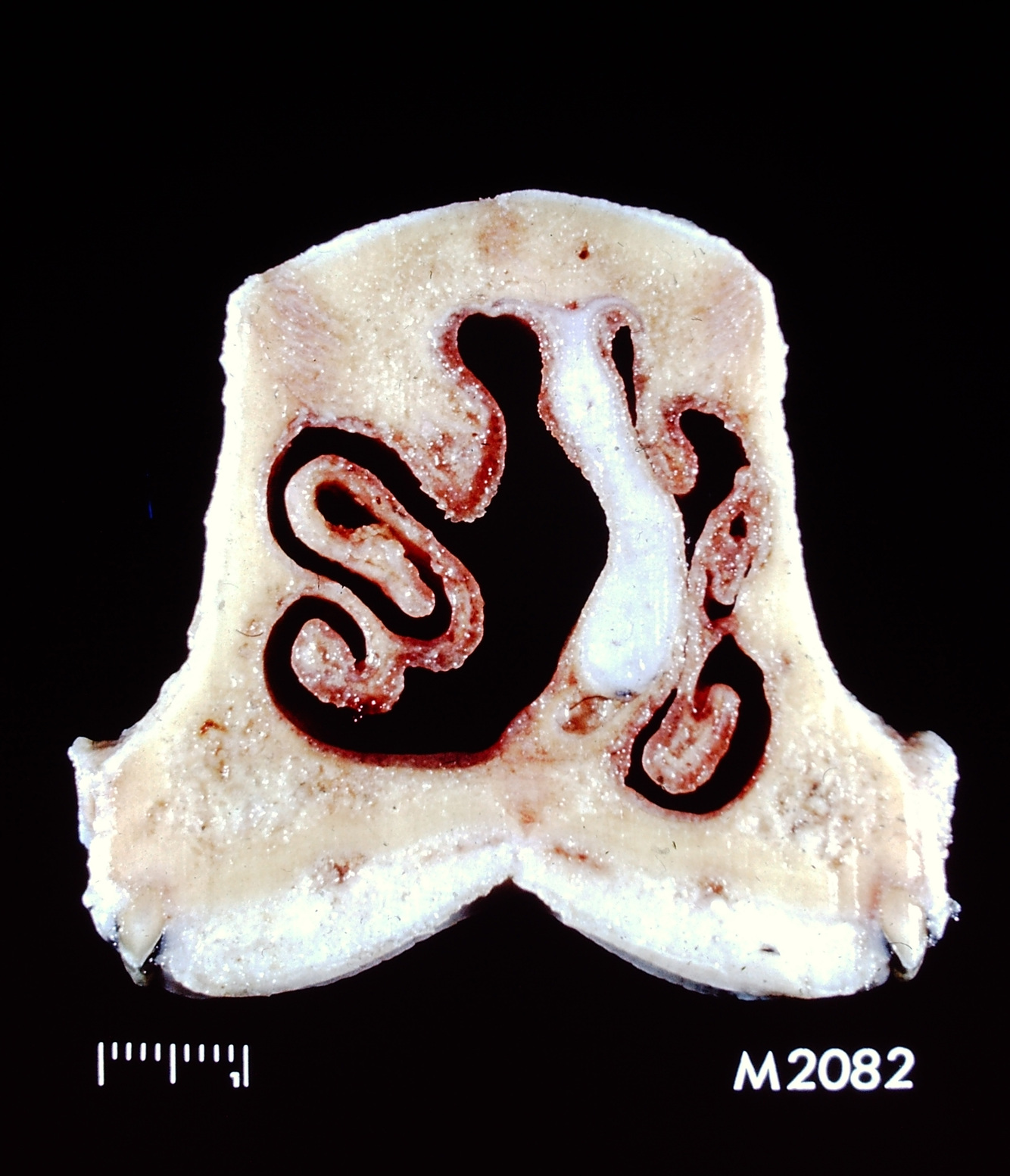 2-4) An interesting series of images from an experimental study. The first one is an unaffected pig, showing the lovely scroll-shaped turbinates. The second image is a moderately affected pig, followed by a severely affected pig. Poor turbinates!
